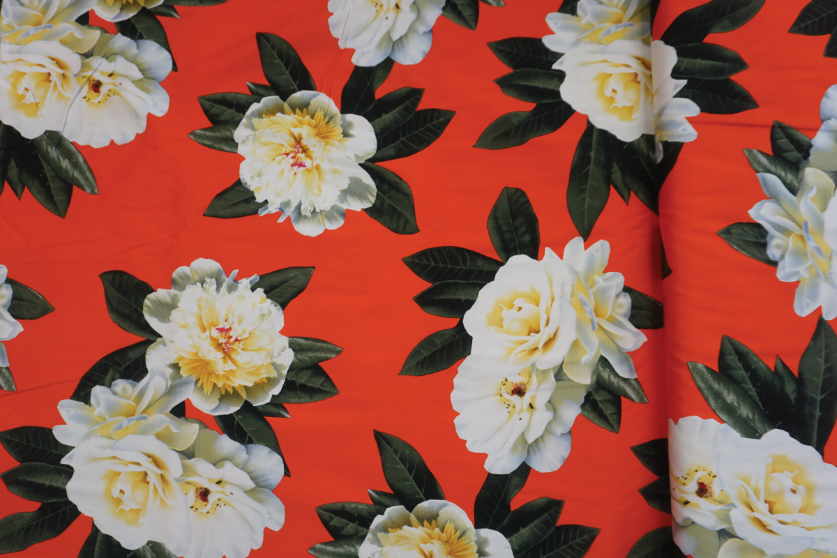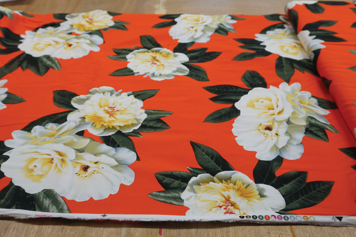 Blood orange with Ivory flowers print stretch cotton Sold Per Meter