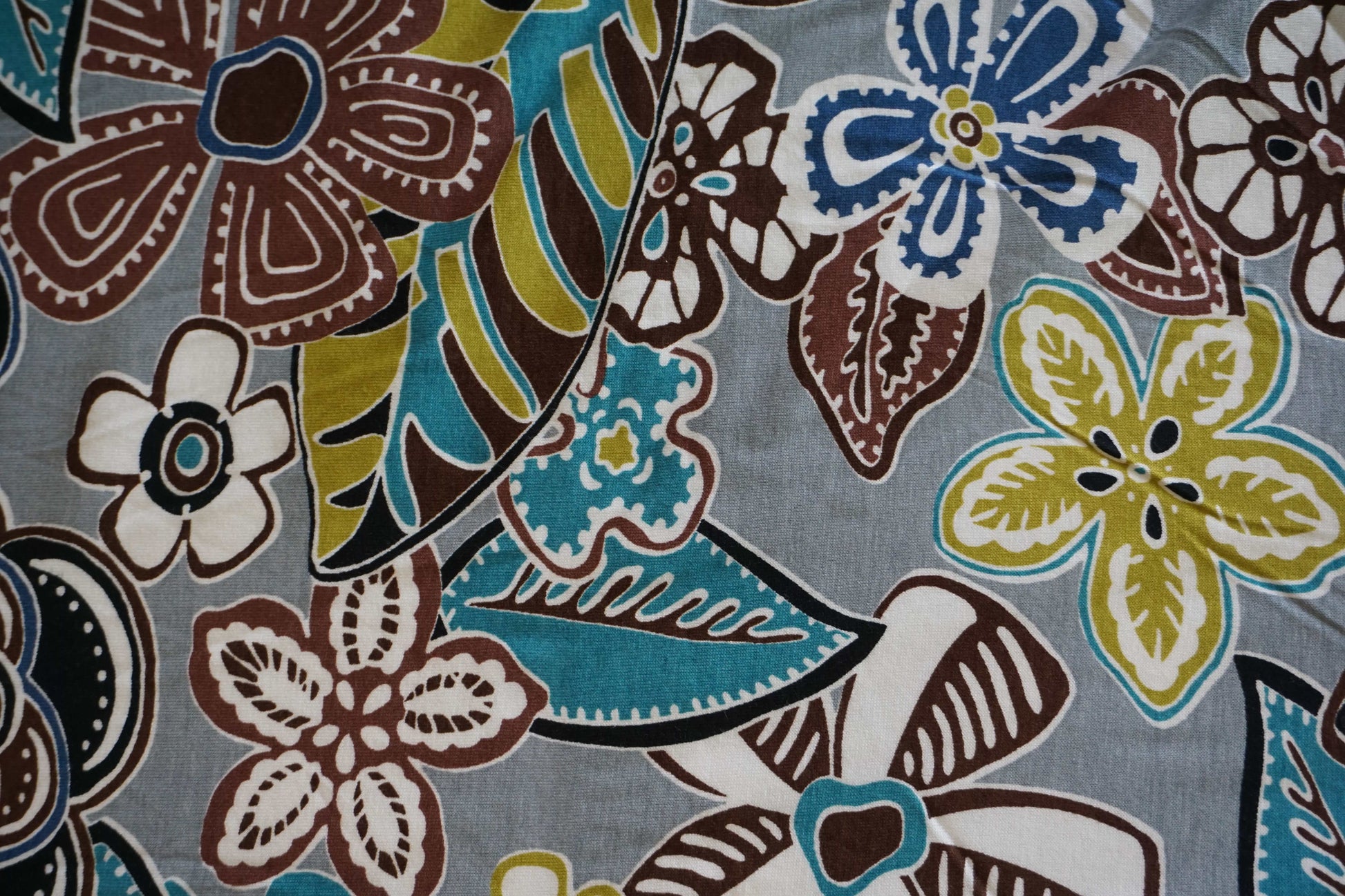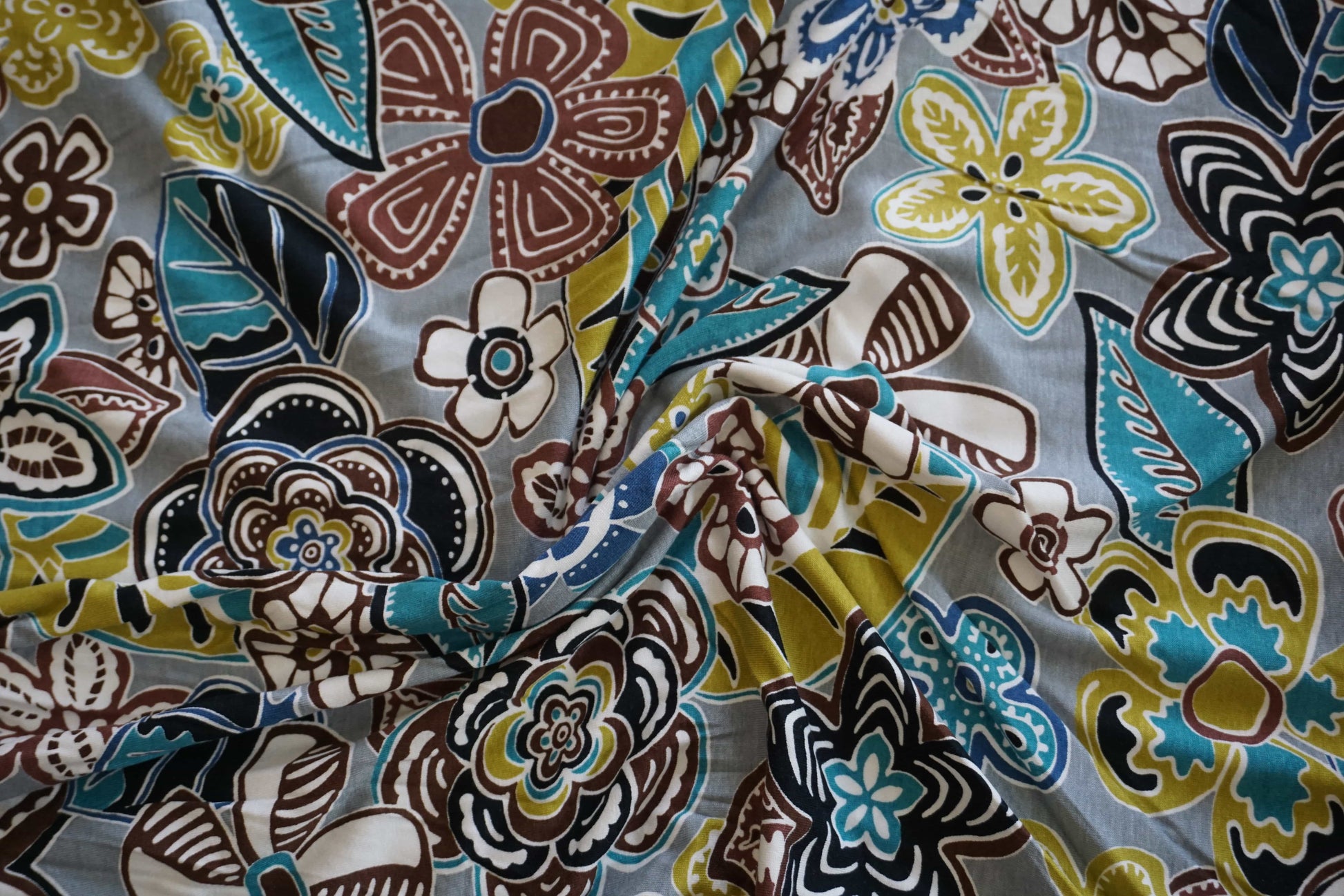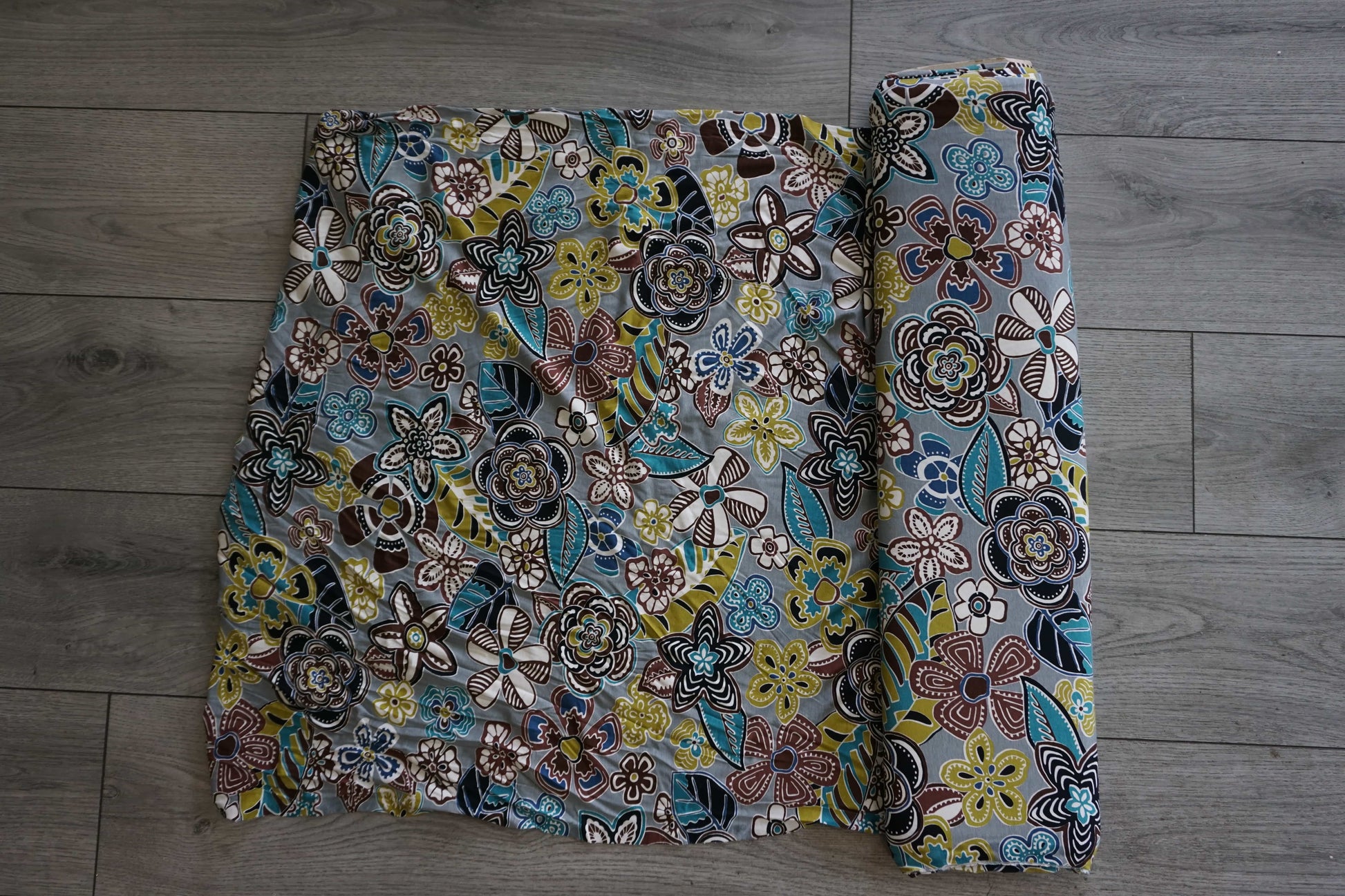 This vibrant floral patterned stretch jersey fabric features a beautiful mix of red, brown, green, white, blue, and grey tones. The soft and flexible nature of jersey makes it perfect for comfortable, breathable garments with excellent drape and movement. 145cm width.
