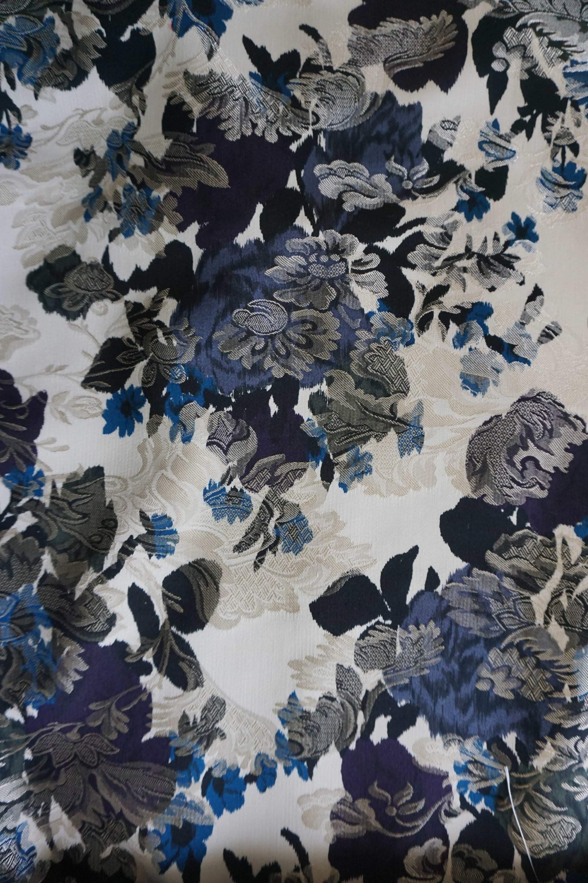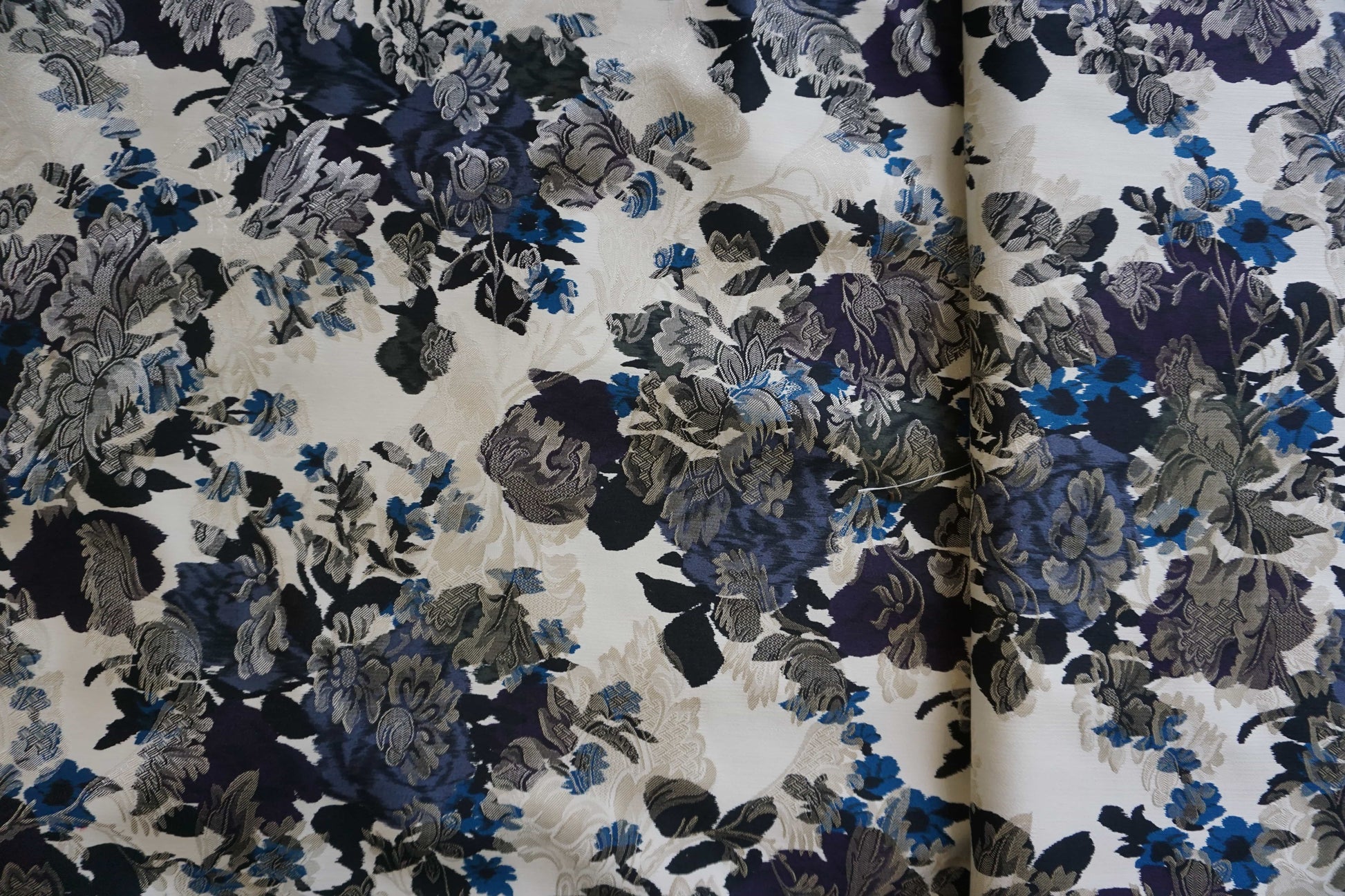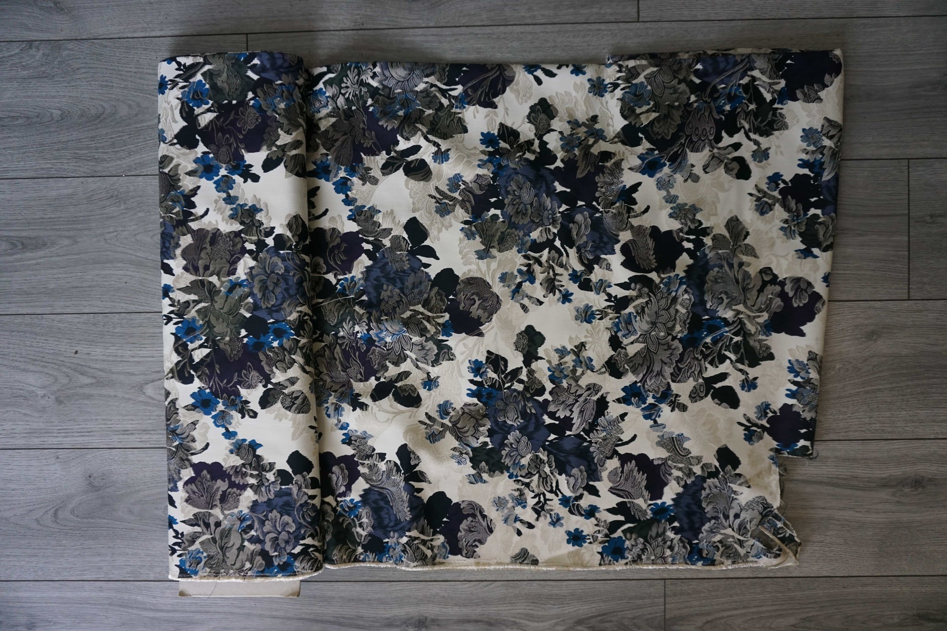 Experience the elegance of this luxurious ivory brocade fabric, adorned with a vibrant floral pattern in deep Greg navy and bright blue hues. Enhanced by subtle shimmering gold accents, the intricate weave adds texture and depth, perfect for creating standout dresses, jackets, and statement accessories. Designed to bring timeless glamour with a modern twist to your fashion projects.