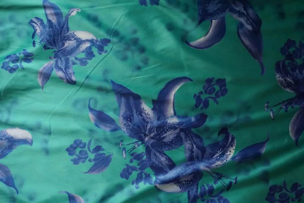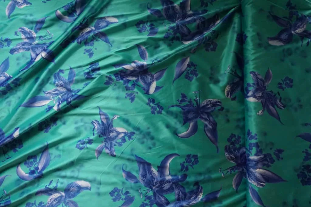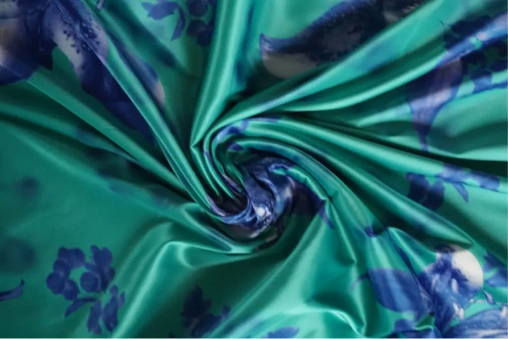 Silky Satin Jade green and blue floral patterned fabric Sold Per Meter
