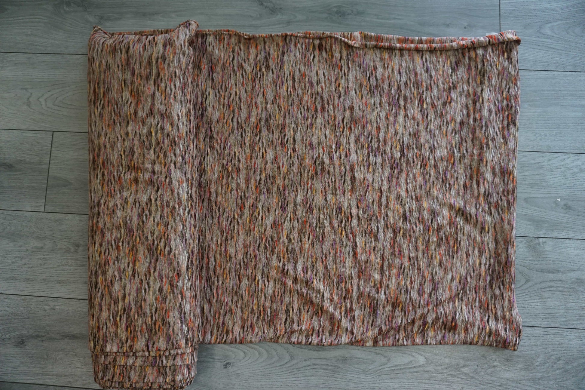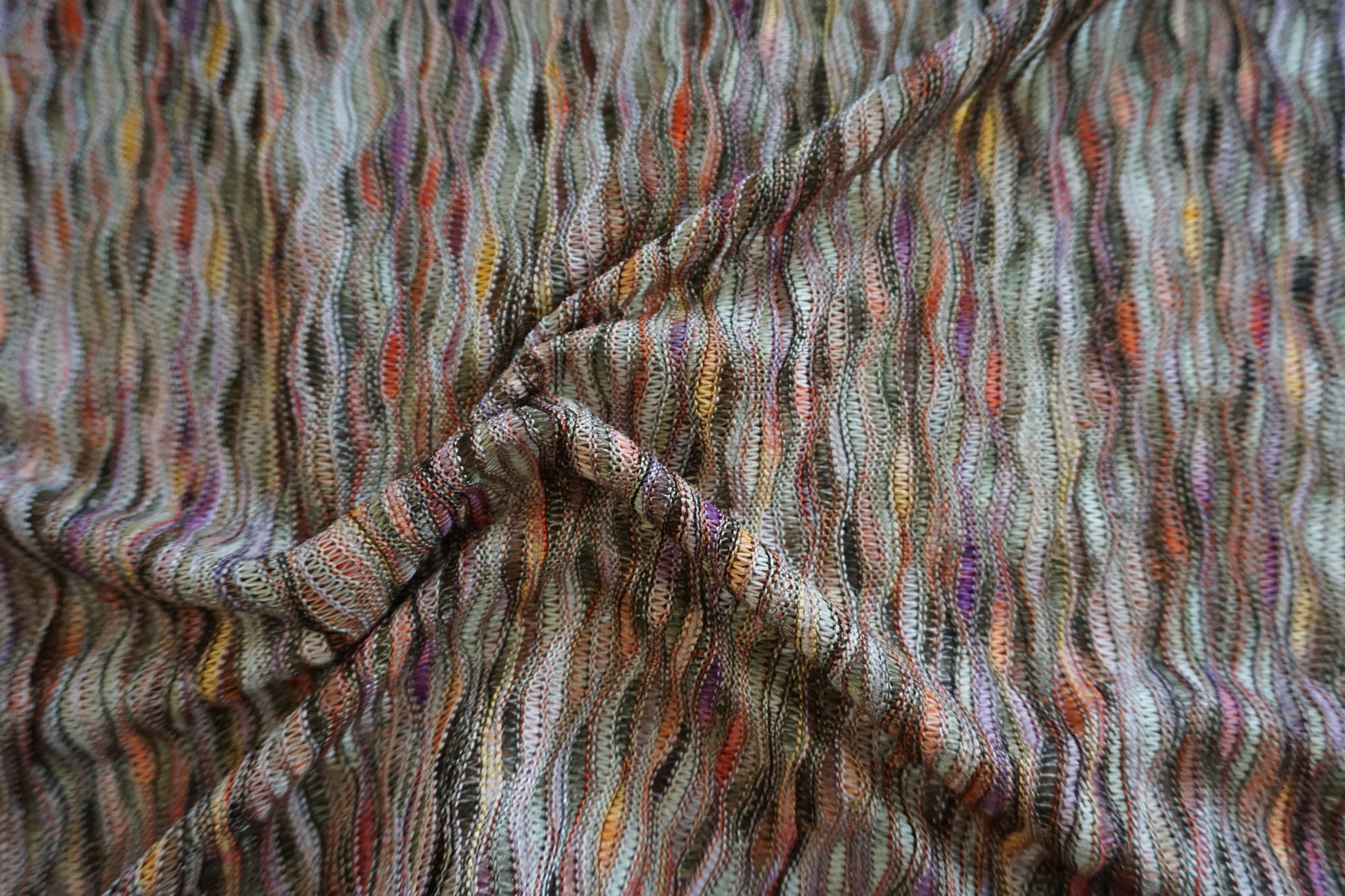 Elevate your creative projects with this stunning multicolor textured knit fabric. Featuring a unique wavy, open-knit design with a harmonious blend of earthy tones including browns, reds, oranges, and subtle purples, this fabric offers both visual interest and tactile appeal. The soft, lightweight, and stretchy composition makes it perfect for a variety of uses such as fashion garments (scarves, shawls, tops), craft projects.
