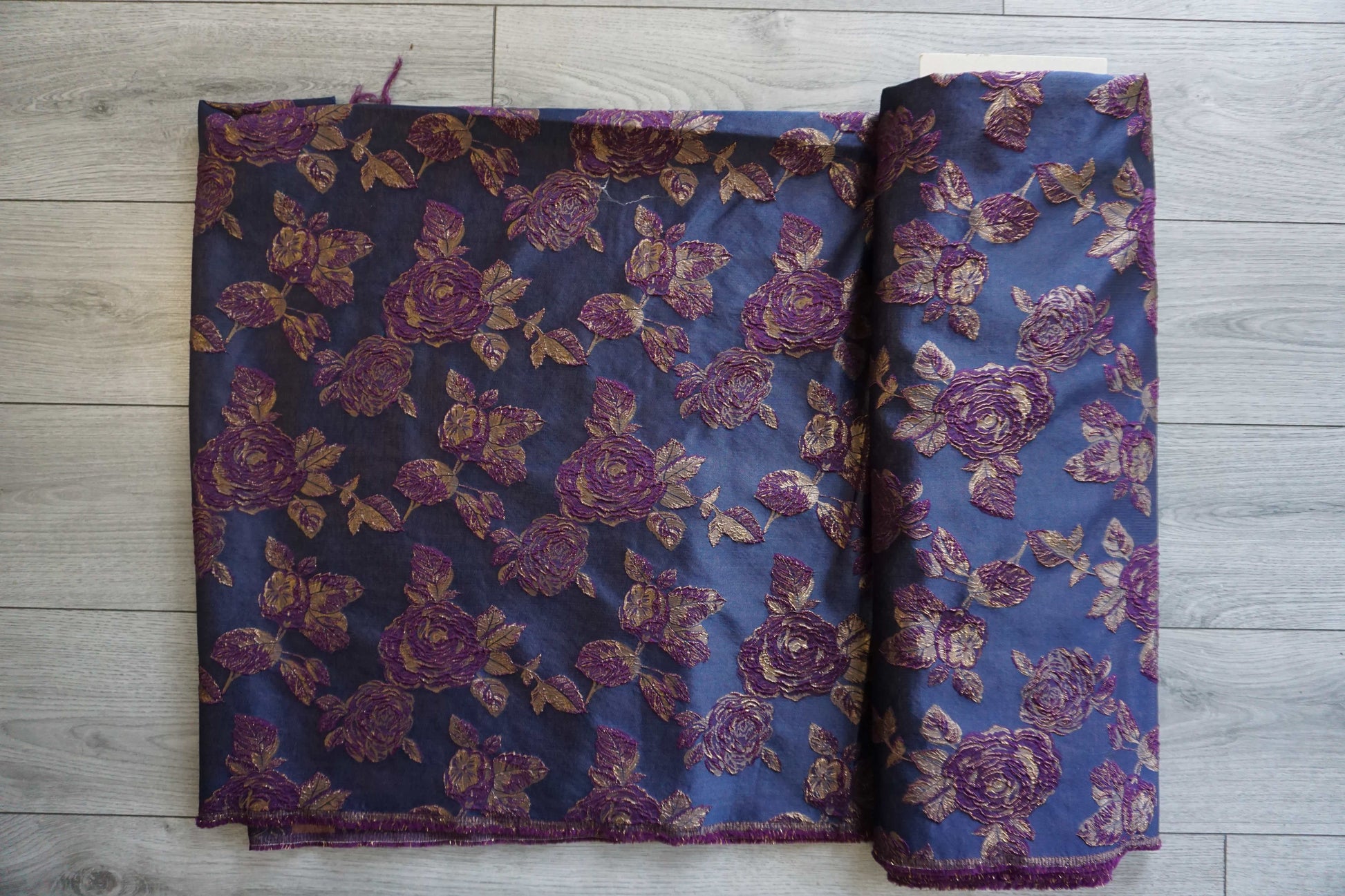 This stunning brocade fabric features an elegant navy background adorned with beautifully raised roses in rich purple and shimmering gold. The intricate woven design creates depth and texture, offering a luxurious feel with a subtle sheen. Perfect for creating sophisticated and eye-catching garments, this fabric combines timeless floral motifs with modern colour contrasts.