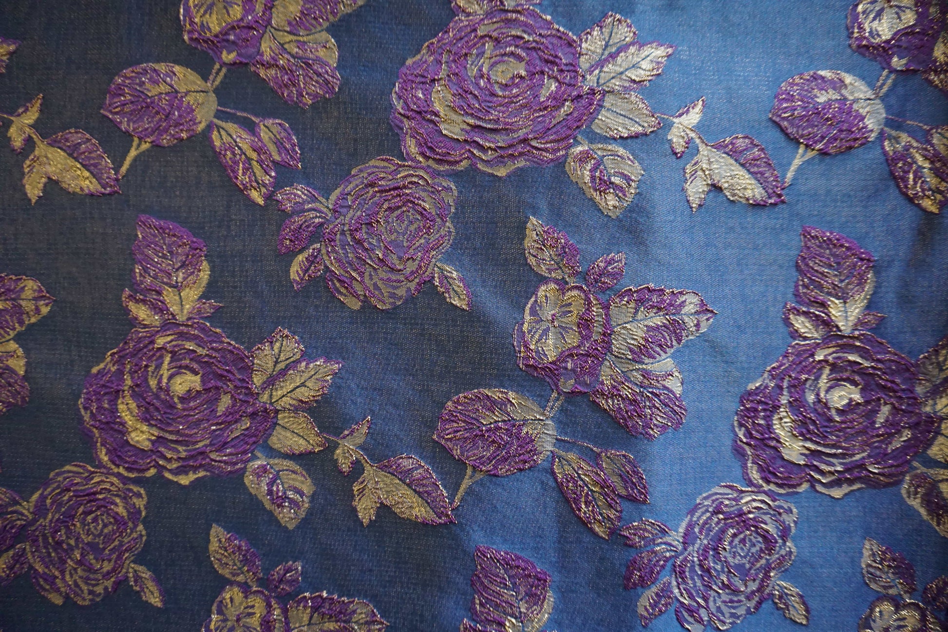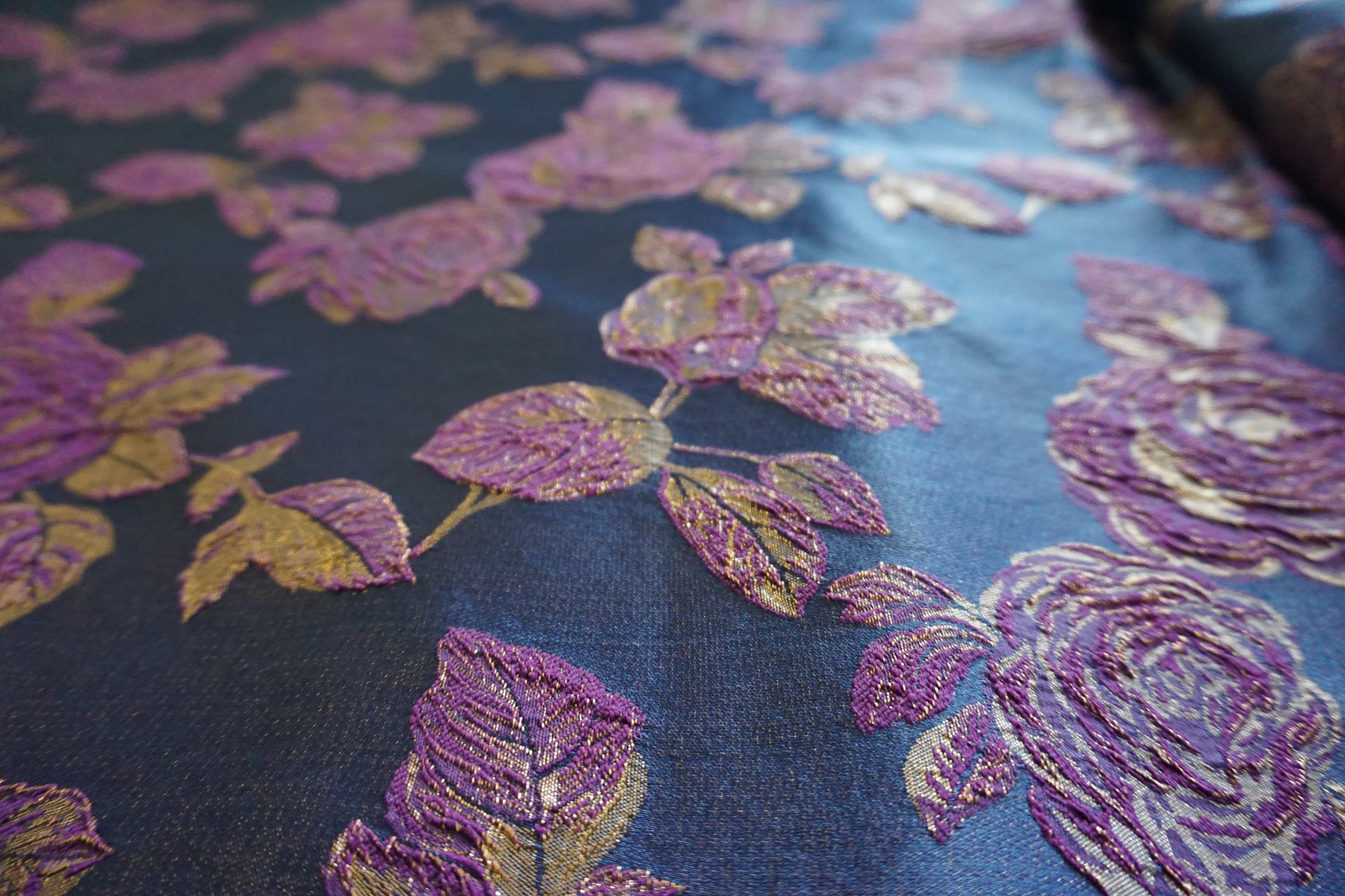 Navy Brocade Fabric with Raised Purple & Gold Rose Design