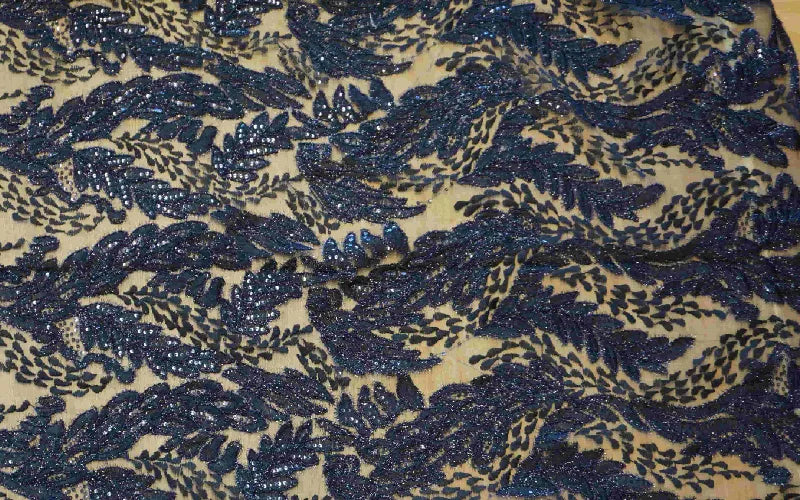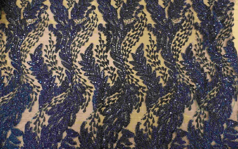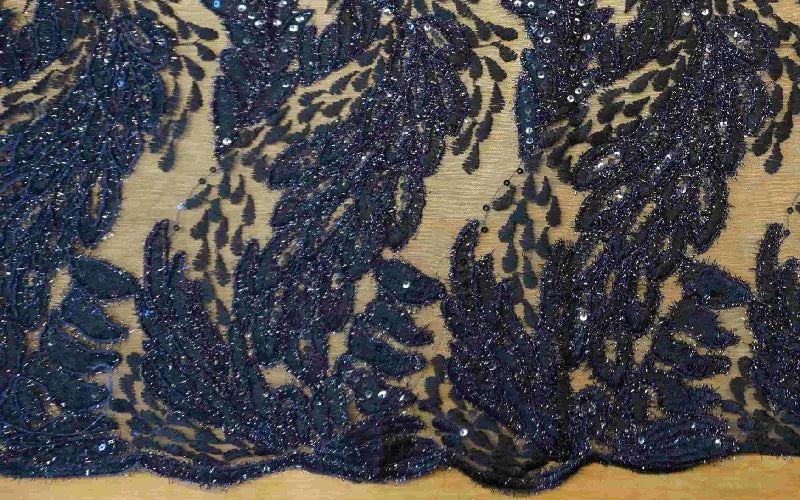 Navy Lace with Feather pattern and Sequin detail. Sold Per Meter