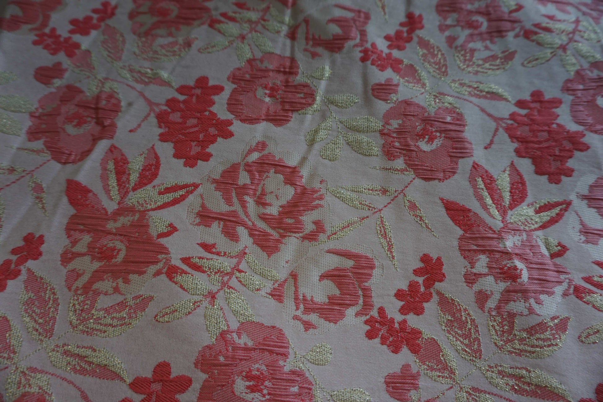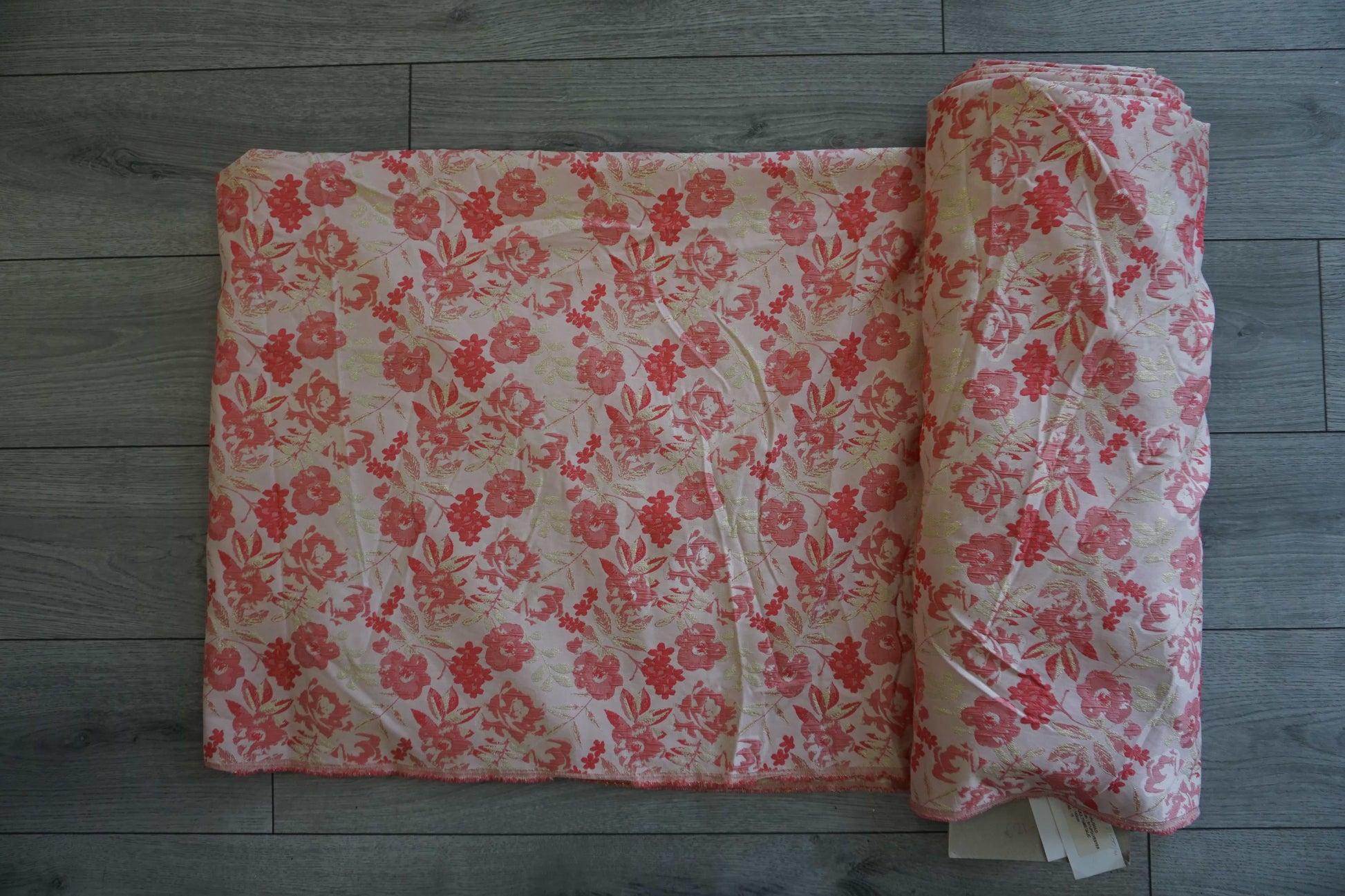 This luxurious pink floral brocade fabric is beautifully enhanced with elegant gold accents, adding a touch of opulence and sophistication. The intricate floral pattern is woven into the fabric, creating a rich, textured surface with a subtle sheen. Perfect for creating statement garments or decorative pieces, this fabric combines timeless elegance with a bold, feminine touch. 142cm width.
