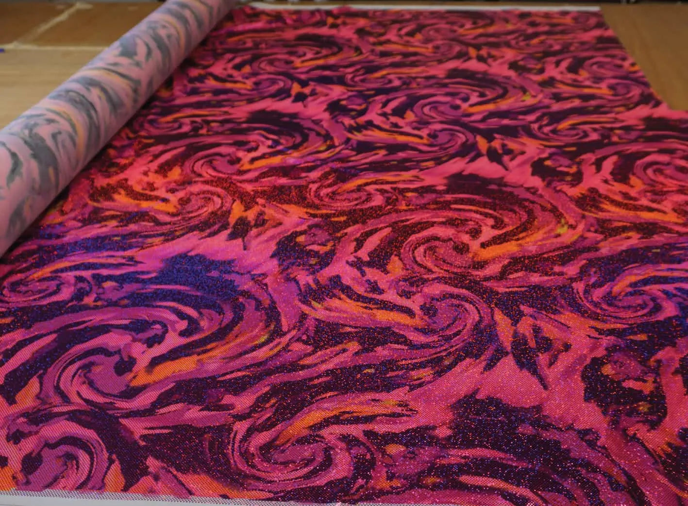 Pink and purple swirl design lycra with shimmer Sold Per Meter