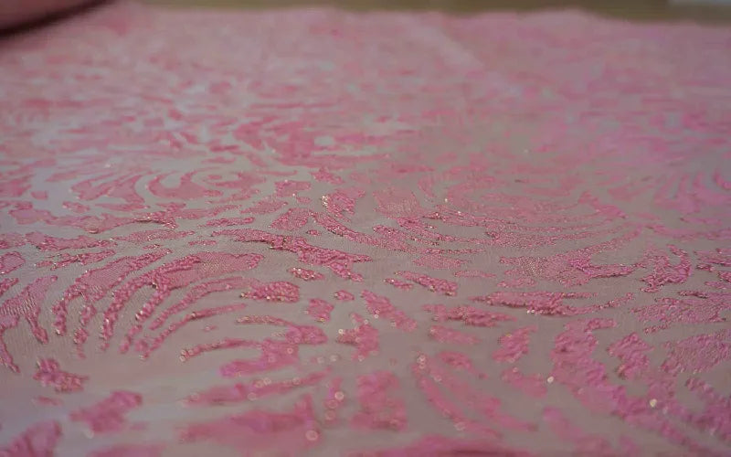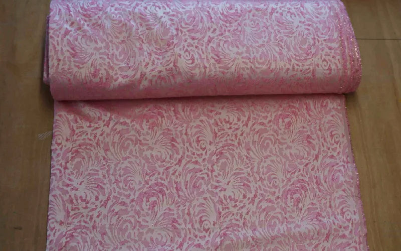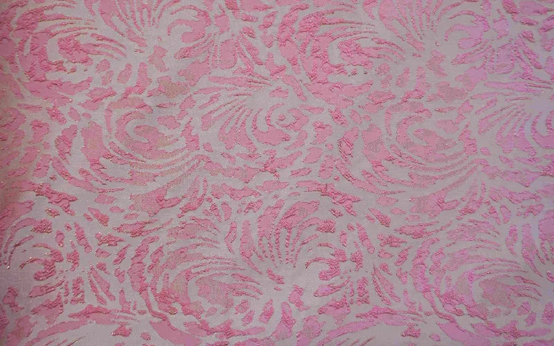 Pink brocade with raised pattern and gold detail. 142cm wide sold per meter