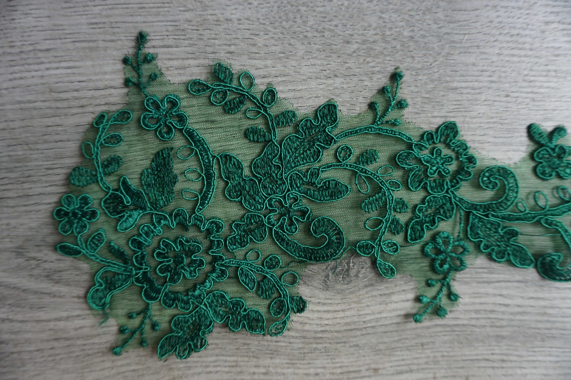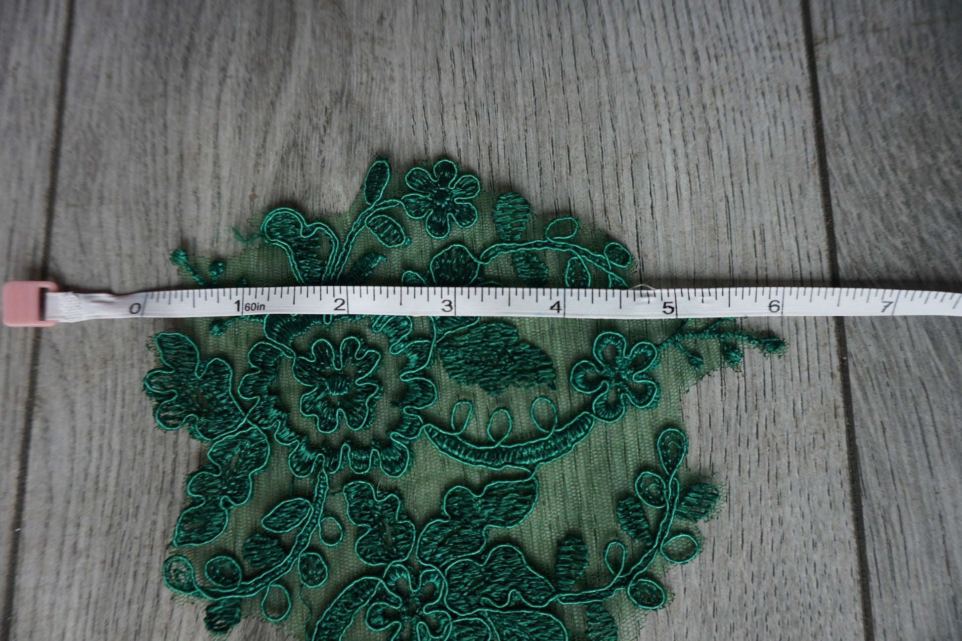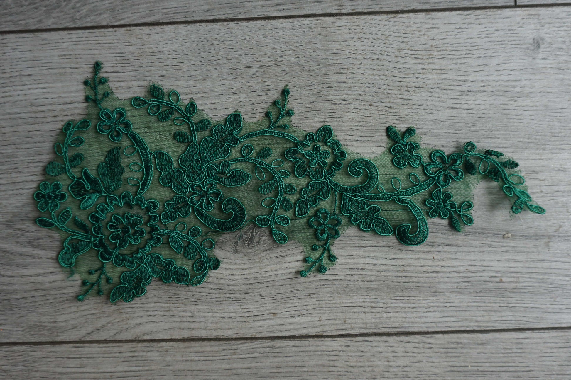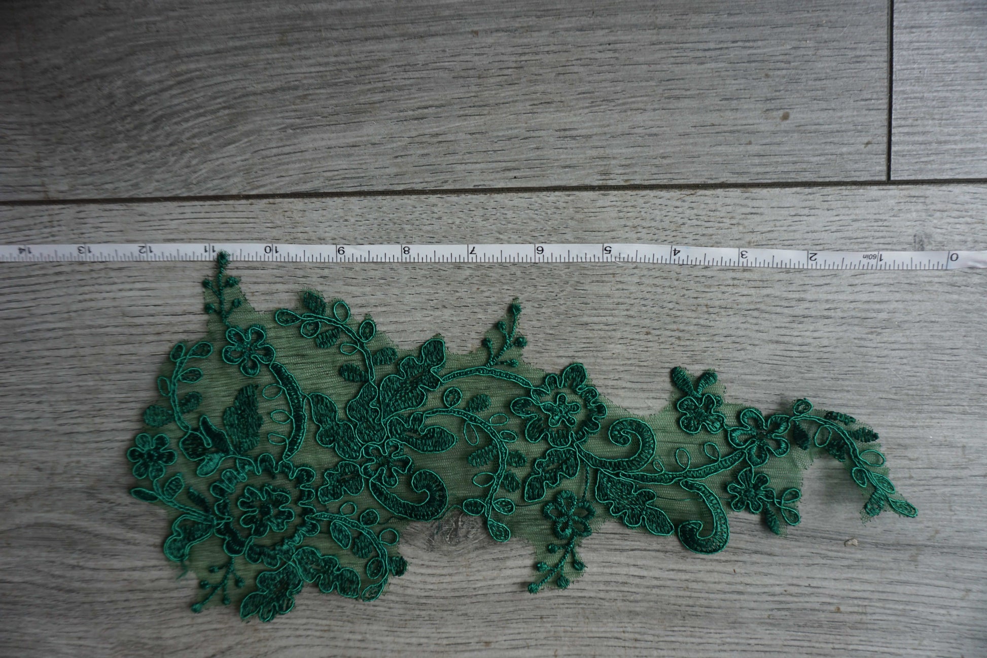 Add a rich, elegant touch to your projects with this emerald green lace appliqué, featuring a detailed floral embroidery design. Perfect for dresses, evening gowns, dance costumes, accessories, and DIY crafts, this applique brings vibrant color and sophistication to any creation.