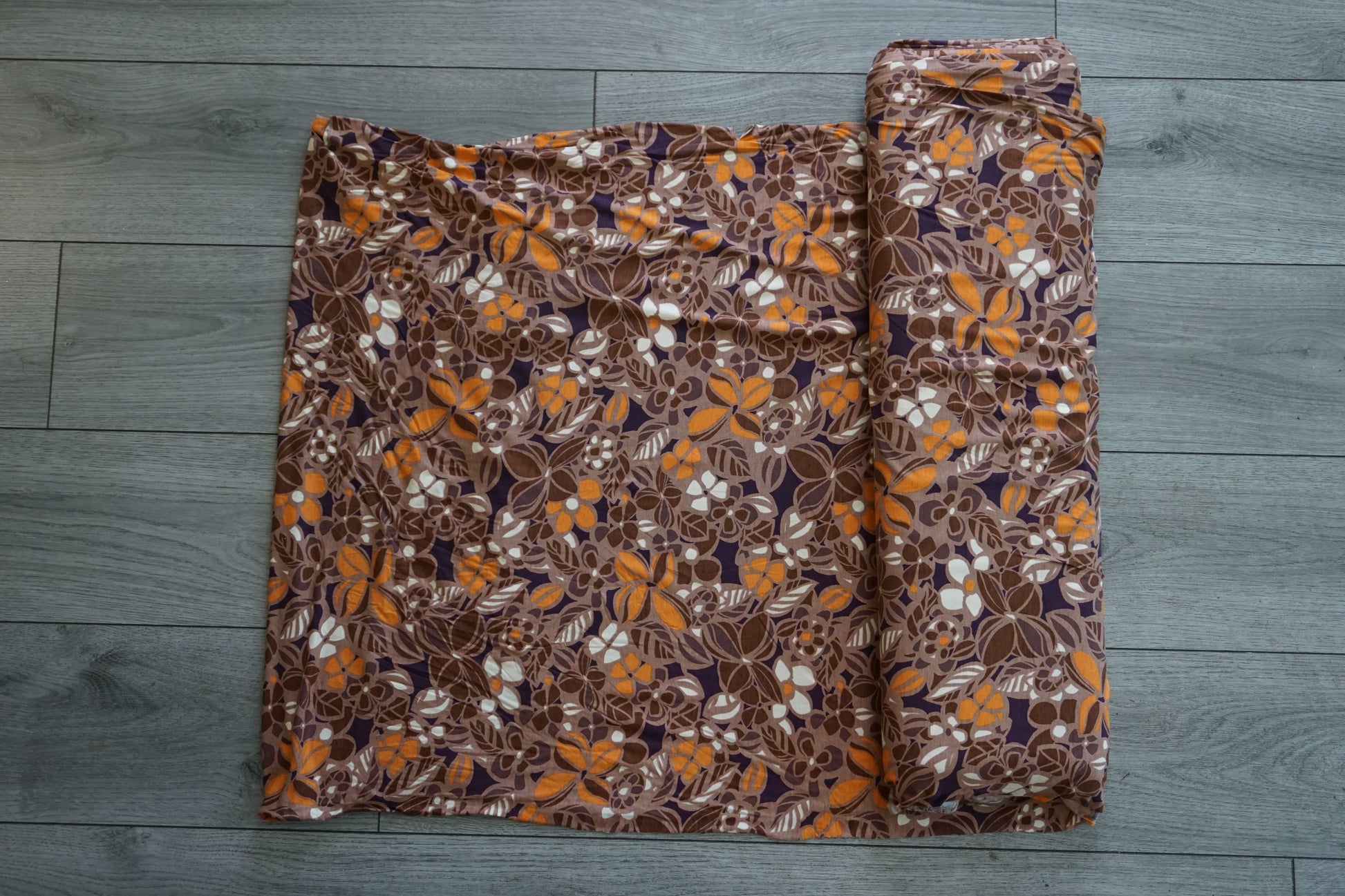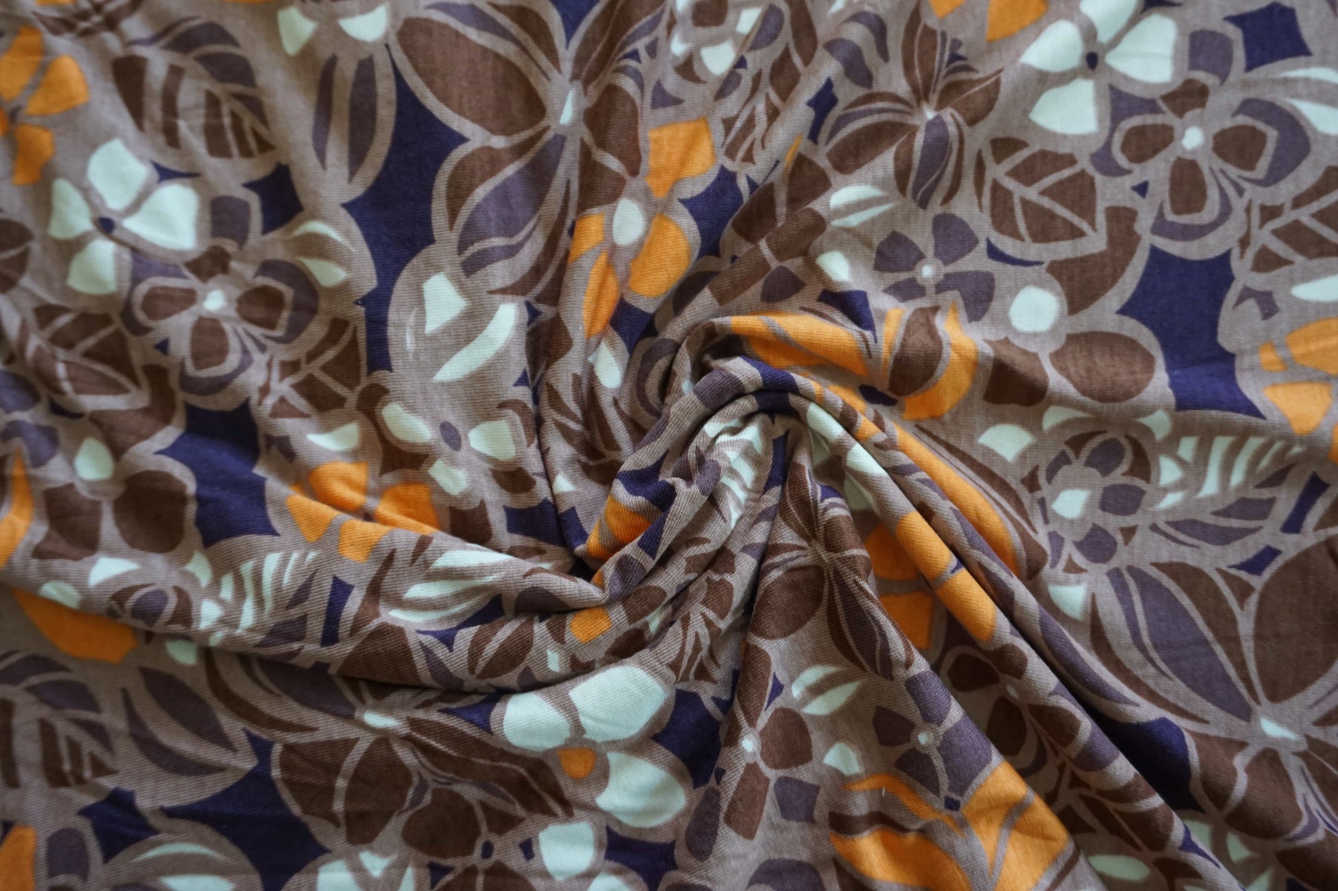 Stretch Knit Material – 135cm Wide – Retro Orange, Brown & Cream Print