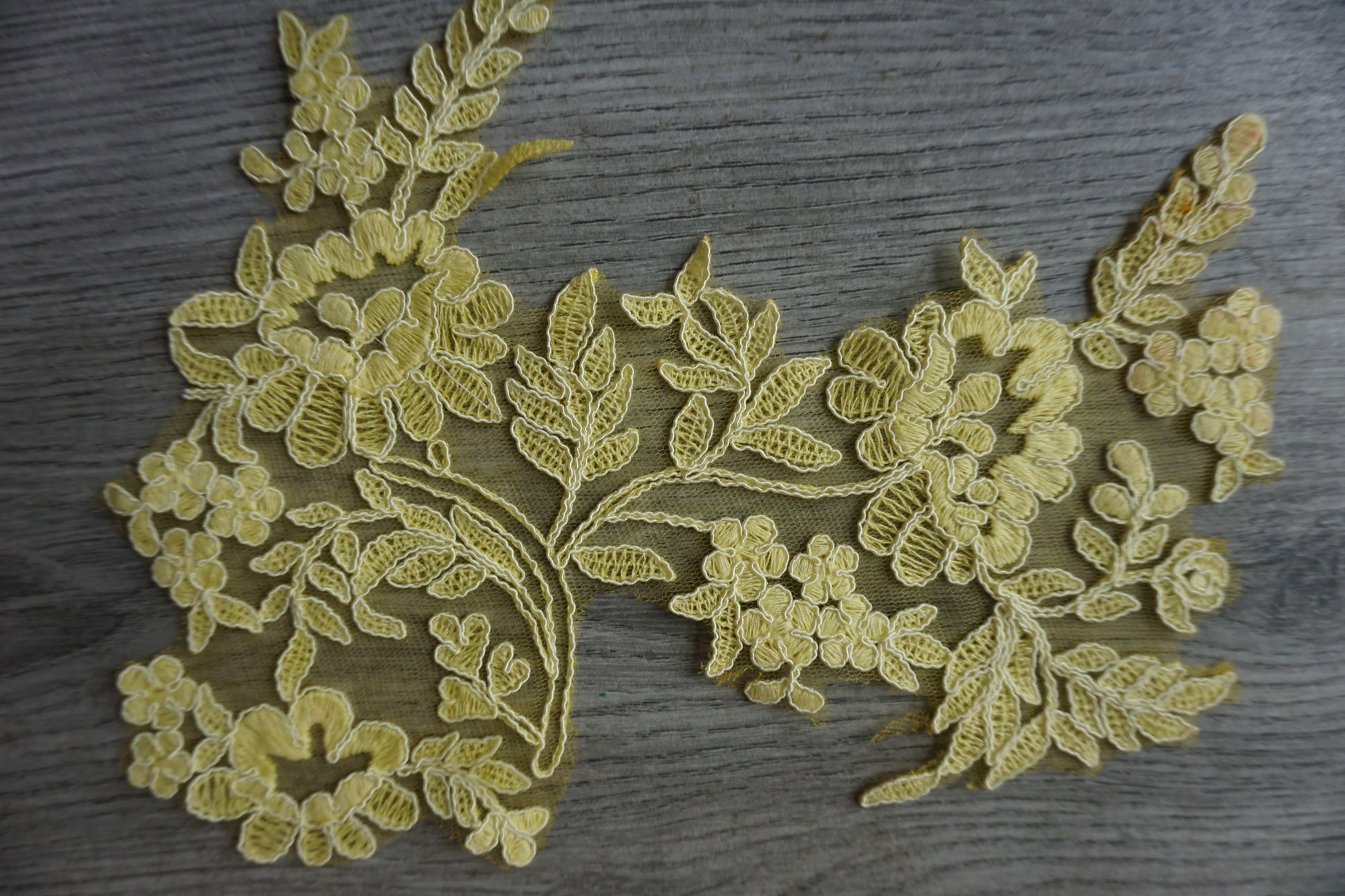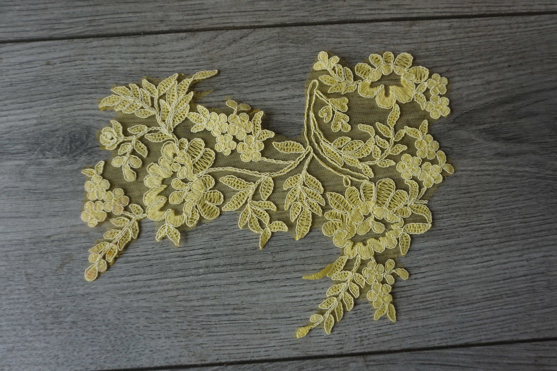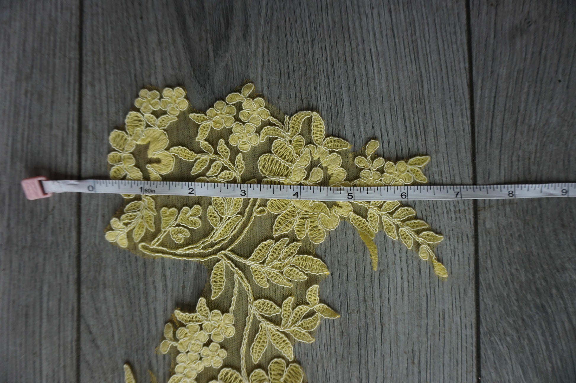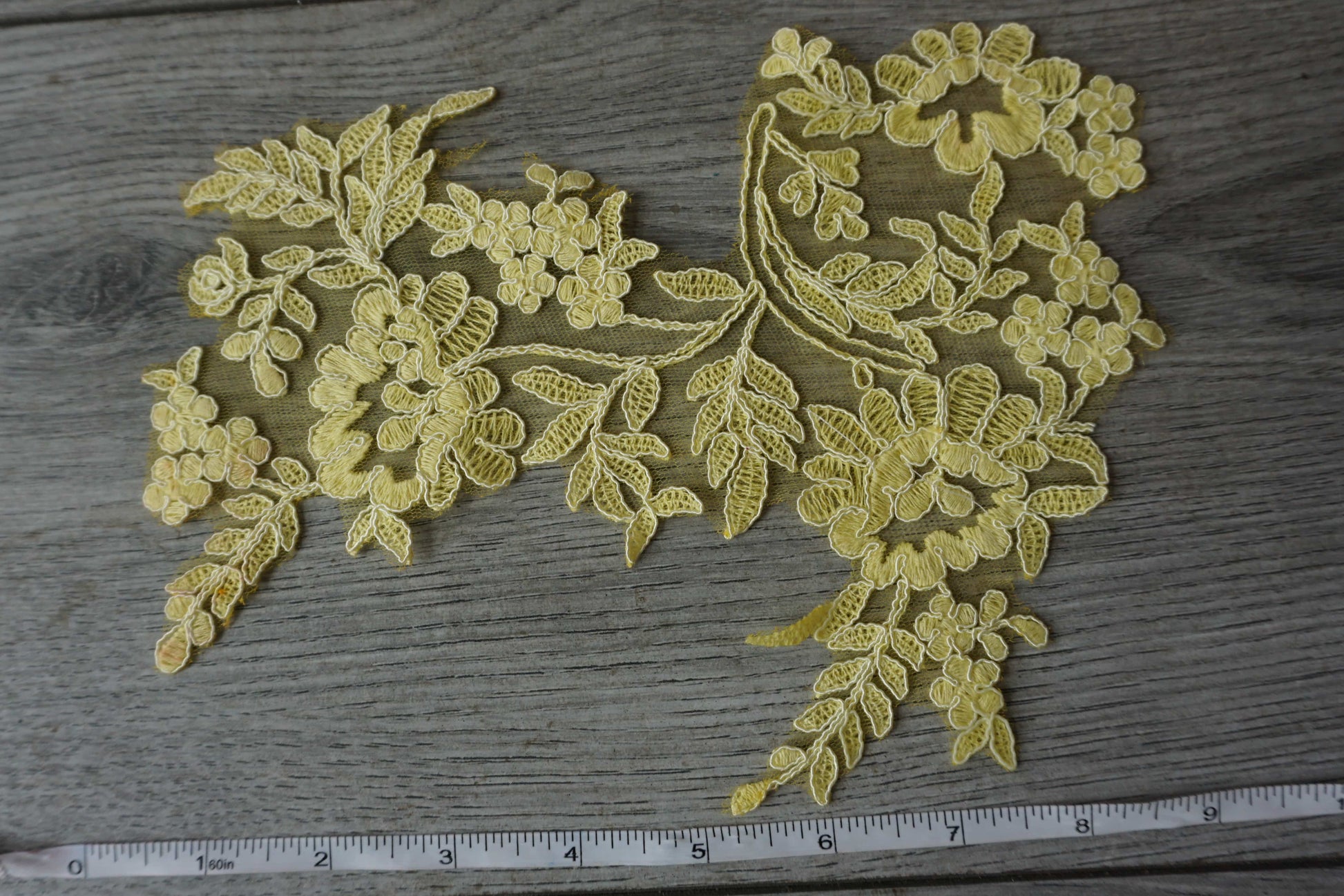 Brighten up your sewing projects with this yellow lace appliqué, designed with intricate floral patterns for a bold and elegant touch. Its lightweight yet durable design makes it easy to sew or attach, perfect for adding a pop of colour to dresses, blouses, costumes, accessories, or home décor projects.
