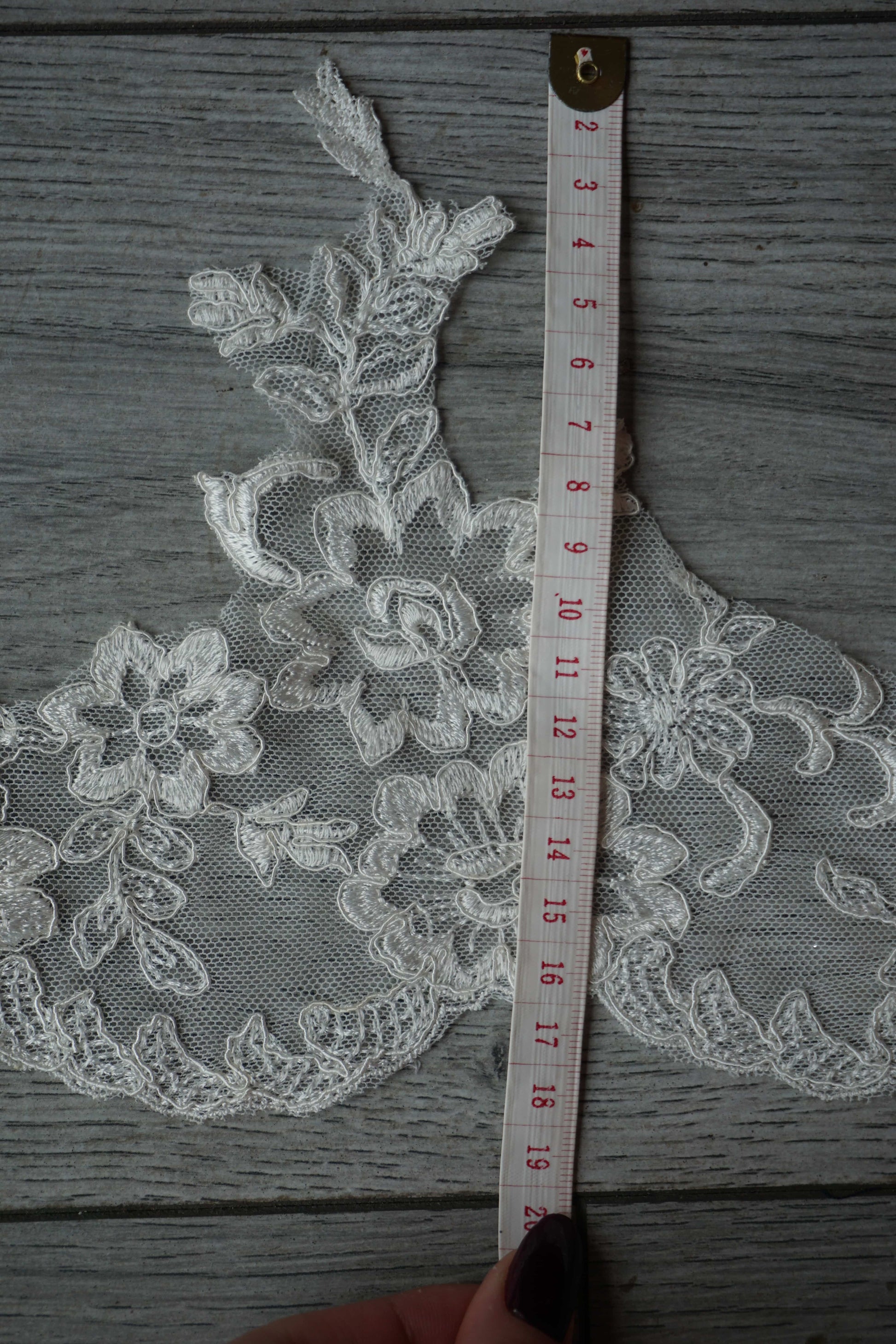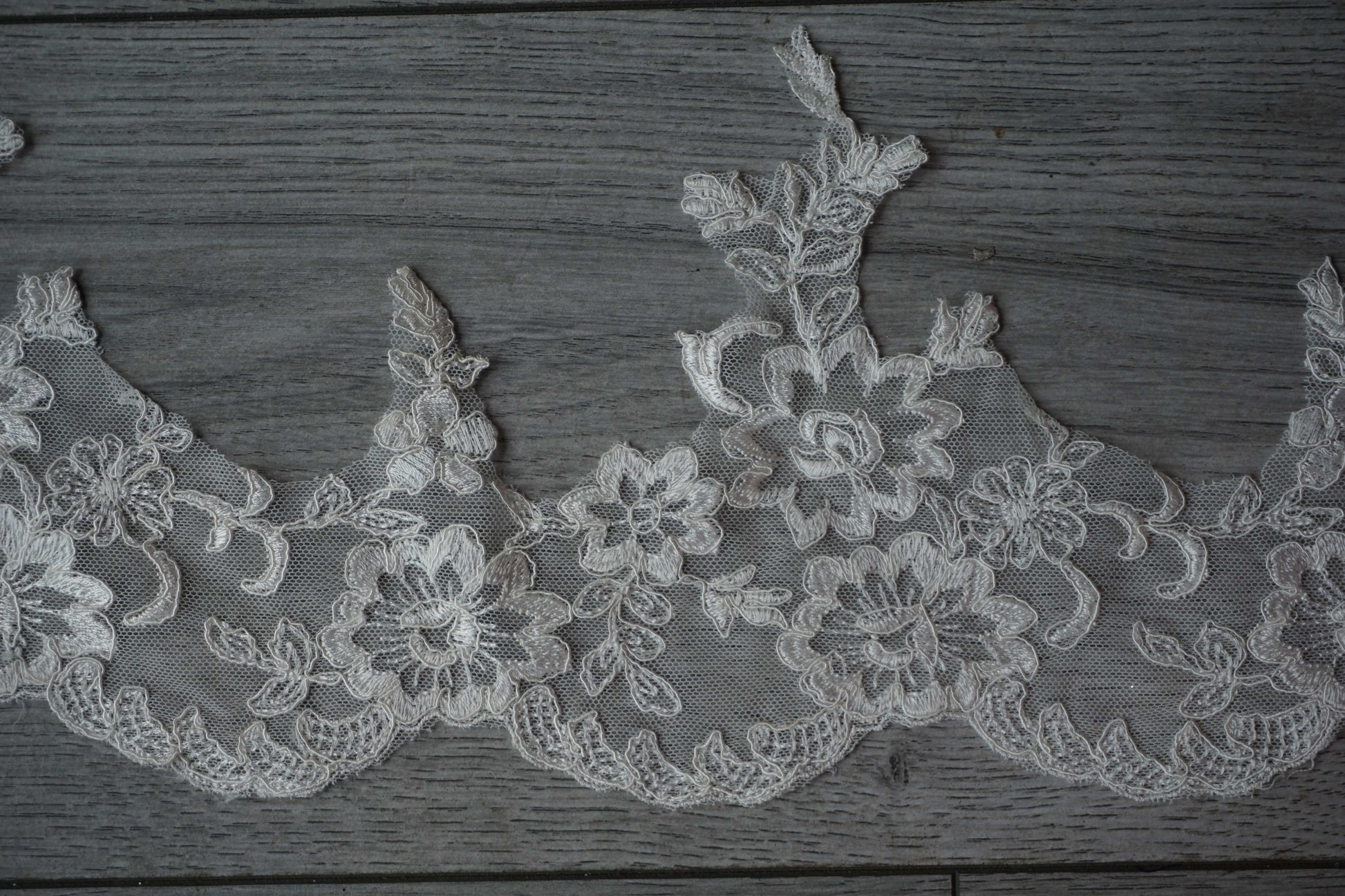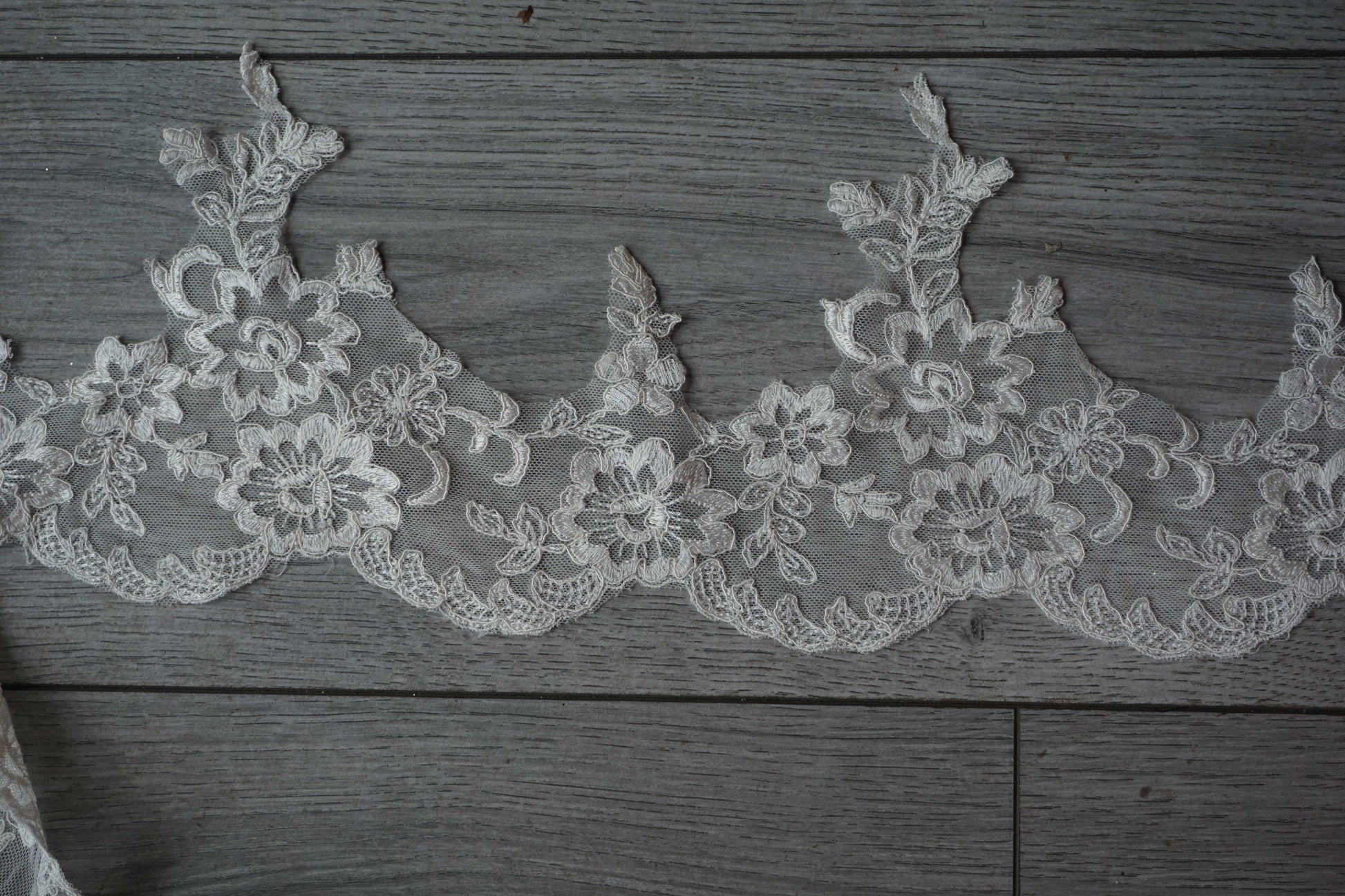 Add timeless elegance to your creations with this Ivory Floral Embroidered Lace Trim. Featuring intricate floral embroidery on a soft tulle base, this wide lace is finished with a delicate scalloped edge for a luxurious look.