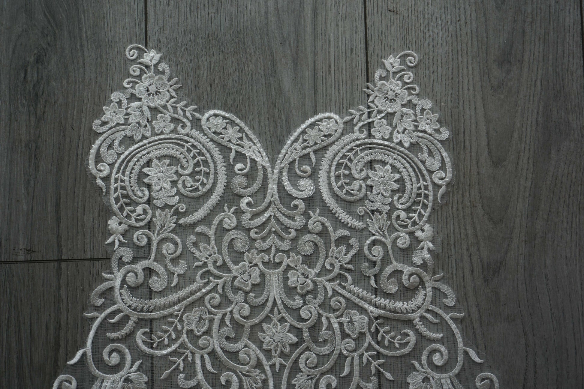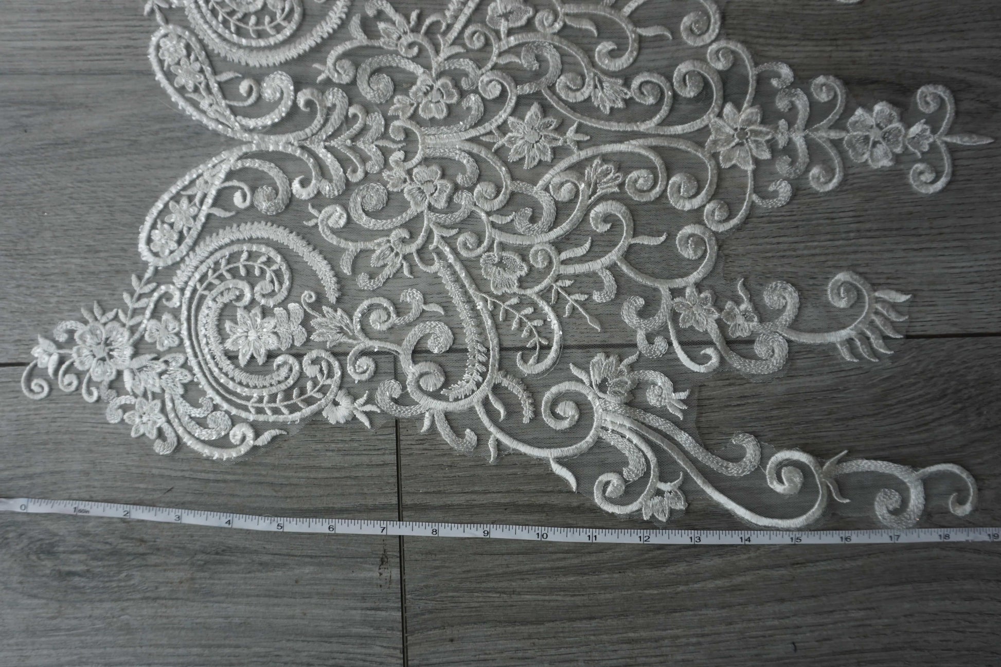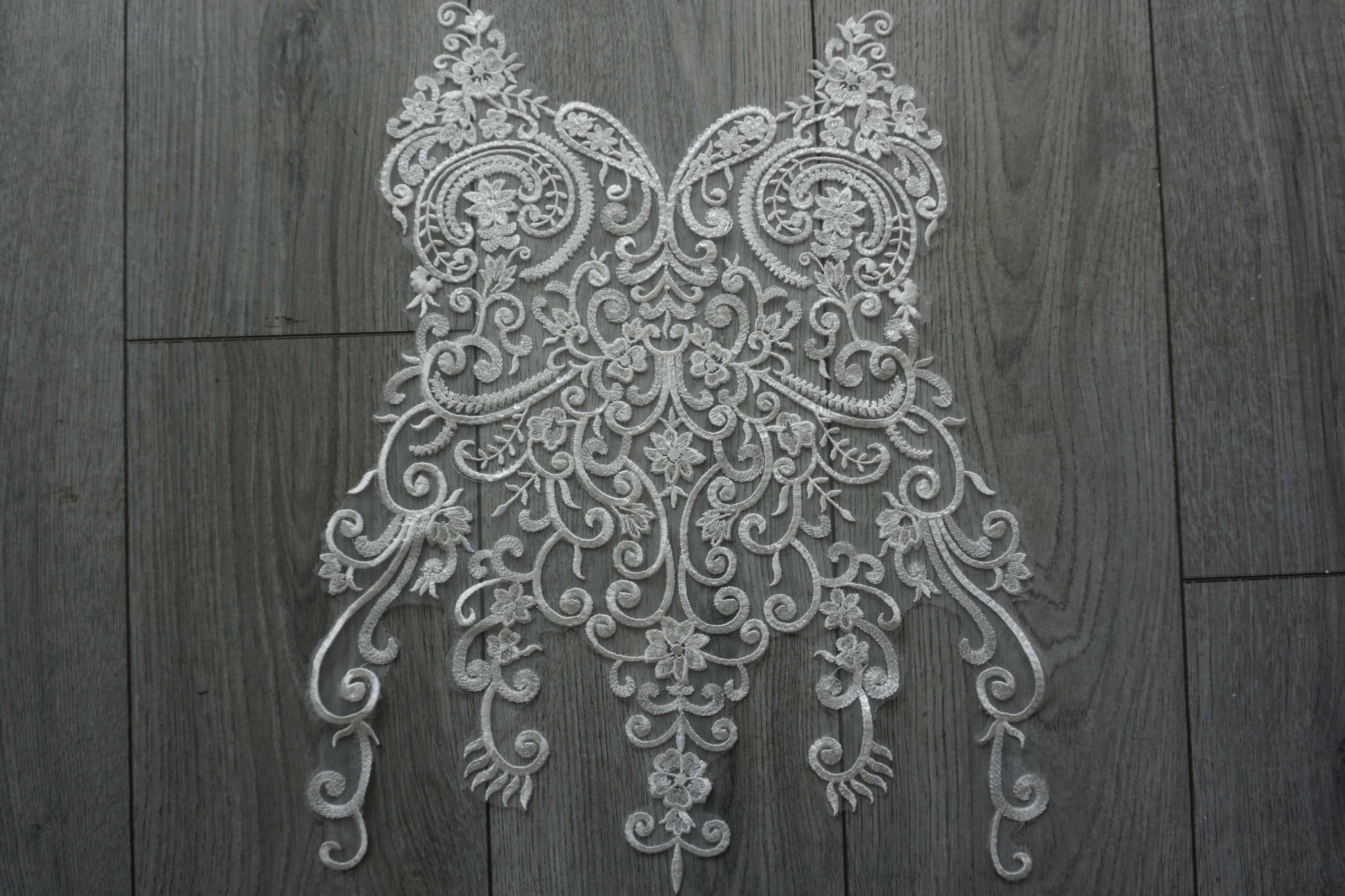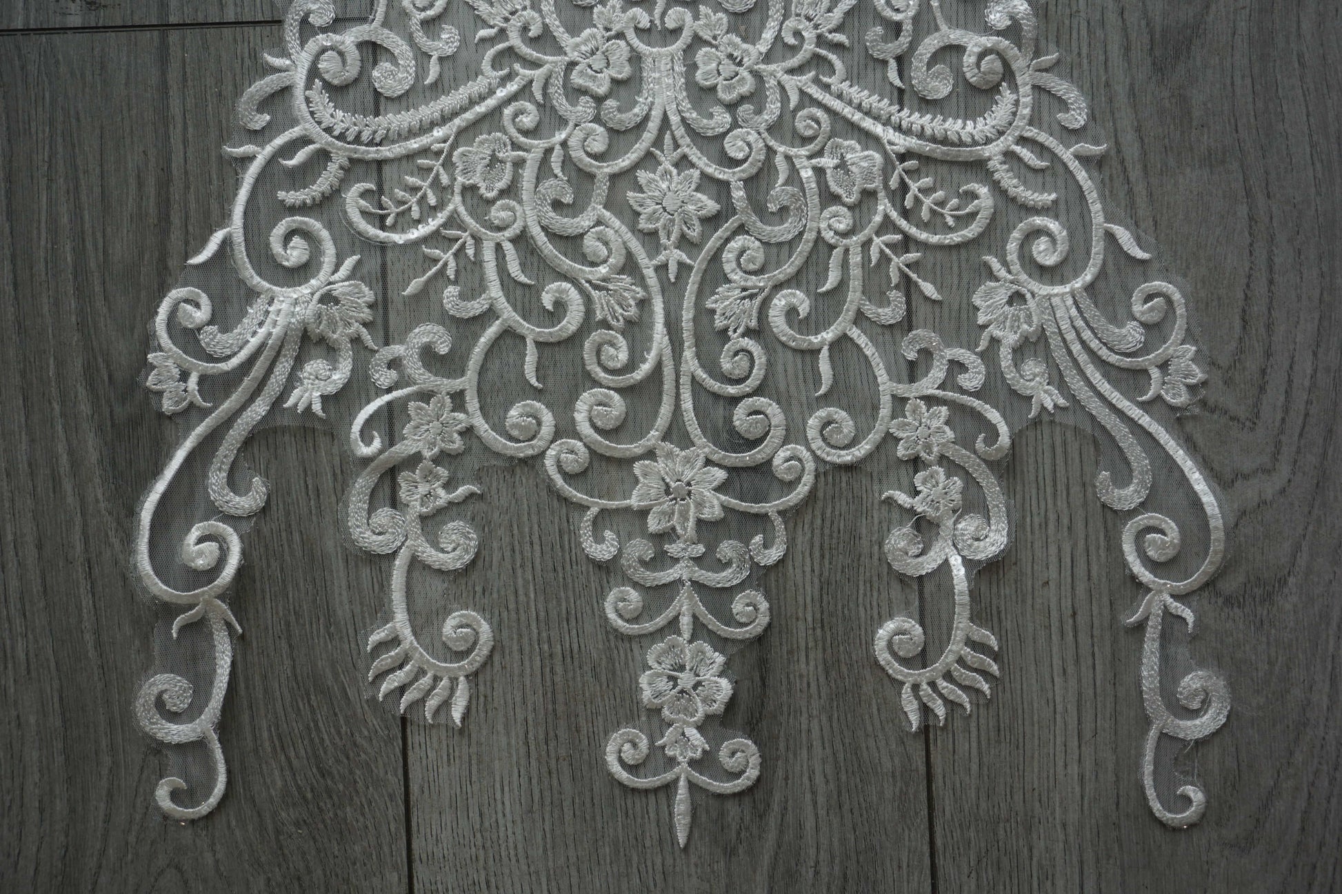 Add sparkle and elegance to your creations with this white lace appliqué, beautifully detailed with embroidery and shimmering sequins. Featuring an ornate floral and scroll design, it’s perfect for bridal gowns, evening dresses, veils, dance costumes, and DIY craft projects.