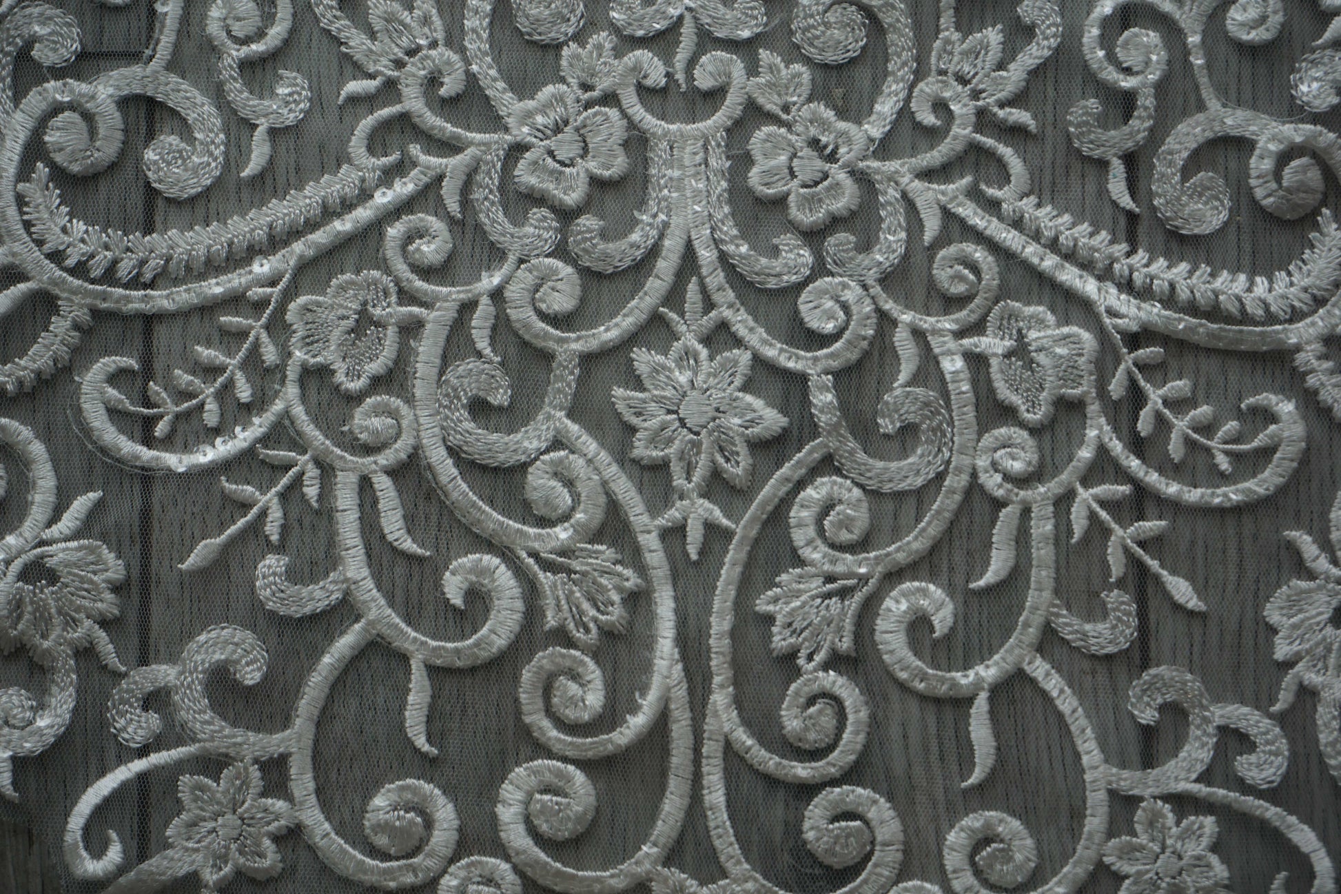 White Sequin Embroidered Lace Appliqué – Floral & Scroll Design